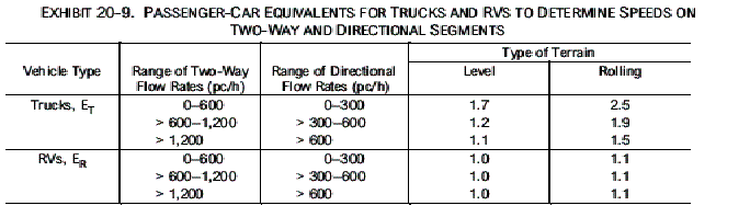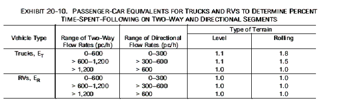 Adjustment for the presence of heavy vehicles in the traffic stream applies to two types of vehicles: trucks and RVs. Buses should not be treated as a separate type of heavy vehicle but should be included with trucks. The heavy-vehicle adjustment factor requires two steps. First, the passenger-car equivalency factors for trucks (ET) and RVs (ER) for the prevailing operating conditions must be found. Then, using these values, an adjustment factor must be computed to correct for all heavy vehicles in the traffic stream.
