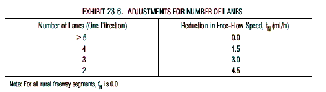 The third adjustment (fN) relates to the effect of the number of lanes in one direction on Free Flow Speed. It is only used for urban and suburban freeways, not rural freeways.