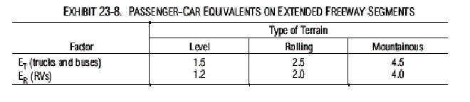 Adjustment for the presence of heavy vehicles in the traffic stream applies to two types of vehicles: trucks and RVs. Buses should not be treated as a separate type of heavy vehicle but should be included with trucks. The heavy-vehicle adjustment factor requires two steps. First, the passenger-car equivalency factors for trucks (ET) and RVs (ER) for the prevailing operating conditions must be found.